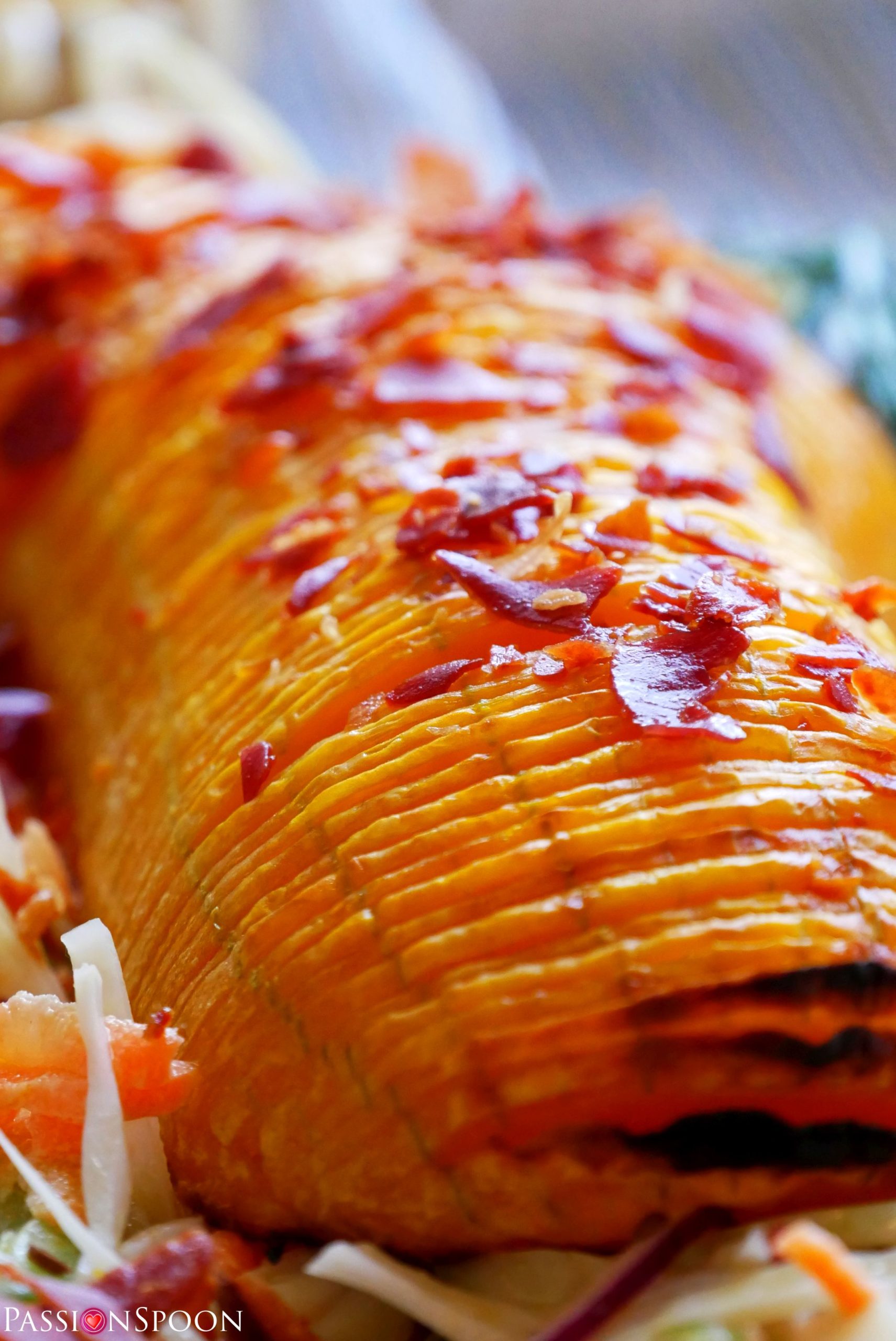 Salty crispy bacon on roasted pumpkin.
